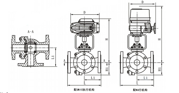 主要由閥體、閥桿、球芯、閥座、填料壓板等主要零部件組成。標準球芯有L型三通雙口孔道和T型三口孔道兩種,改變球芯與管道的相對角度,可以對三支管道流體實現不同的組合控制:T型孔道可起分流合流作用,L型孔道起配比作用,適用于液體、氣體、蒸汽等介質的配比調節與控制。