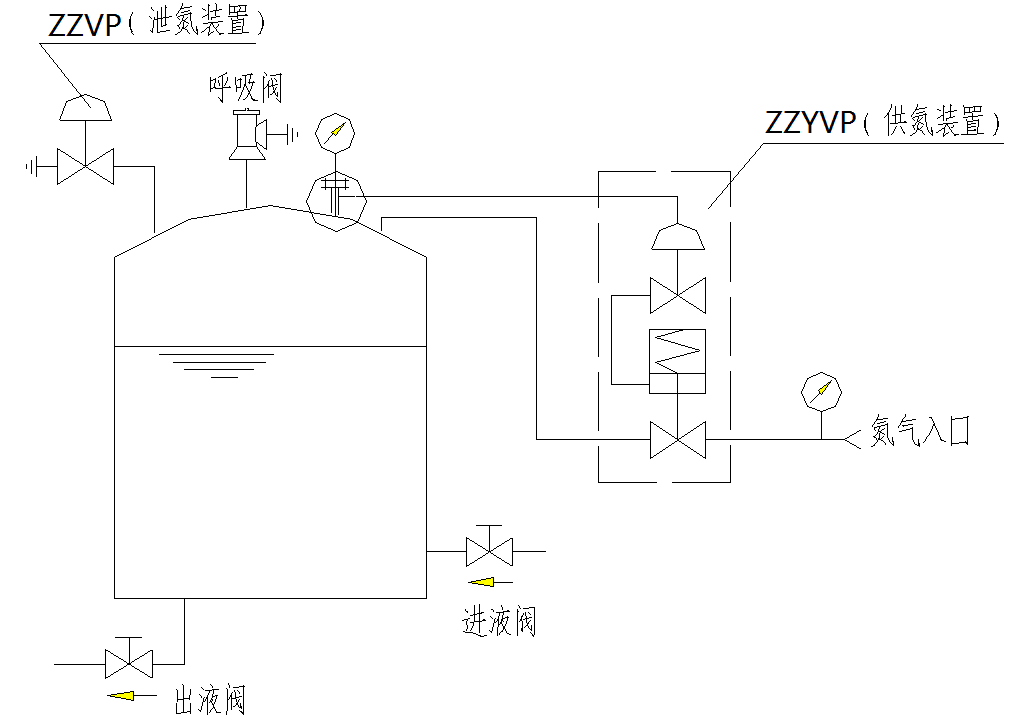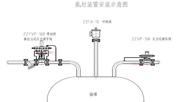 氮封裝置示意圖中貯罐內(nèi)成品油上端覆蓋氮?dú)猓鋲毫σ话阍?00mmH2O左右,通過(guò)氮封保護(hù)器控制。出液閥開(kāi)啟放油時(shí),貯罐內(nèi)液位下降,此時(shí)ZYVP供氮調(diào)節(jié)閥開(kāi)度增大,向罐內(nèi)補(bǔ)充氮?dú)馐箟毫υ黾又猎O(shè)定值。進(jìn)液閥開(kāi)啟進(jìn)油時(shí),液位上升,氣相部分容積減小,氮?dú)鈮毫ι仙藭r(shí)ZYVP供氮調(diào)節(jié)閥關(guān)閉,而ZZVP泄氮調(diào)節(jié)閥在壓力控制器作用下開(kāi)啟,排出氮?dú)馐箟毫抵猎O(shè)定值,壓力設(shè)定值比供氮閥要高。而呼吸閥的呼氣壓力設(shè)定值比ZZVP泄氮高。