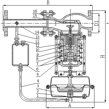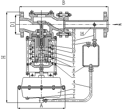 調(diào)壓閥主要有檢測執(zhí)行機(jī)構(gòu)、調(diào)壓閥、冷凝器與閥后接管等腰三角形四部分組成,其結(jié)構(gòu)(見圖一)。