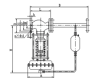圖一b:用于控制閥前壓力的調(diào)壓閥,閥的作用方式為壓開型。其原理如下:介質(zhì)由箭頭方向流入閥體,另一路經(jīng)冷凝器(介質(zhì)為蒸汽時(shí)使用)冷卻后,被引入執(zhí)行機(jī)構(gòu)作用于膜片上,使閥芯隨之發(fā)生相應(yīng)的位移,達(dá)到泄壓、穩(wěn)壓之目的。如閥前壓力增加,作用于膜片上的力增加,壓縮彈簧,帶動調(diào)芯,使閥門開啟度增大,直到閥前壓力下降到設(shè)定值為止。同理,如閥門開啟度減小,直到閥前壓力上升到設(shè)定值為止。