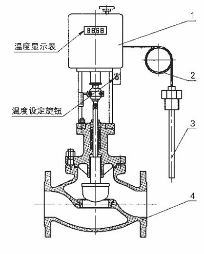 設(shè)定點(diǎn)的溫度通過溫包傳遞至智能溫控電動執(zhí)行器,執(zhí)行器經(jīng)過與設(shè)定的溫度比較后,電動執(zhí)行機(jī)構(gòu)產(chǎn)生一個軸向動力,帶動閥桿、閥芯產(chǎn)生直線位移,實(shí)現(xiàn)閥門的自動調(diào)節(jié),從而達(dá)到自動控制溫度的目的。設(shè)定點(diǎn)溫度可在現(xiàn)場高速設(shè)定。