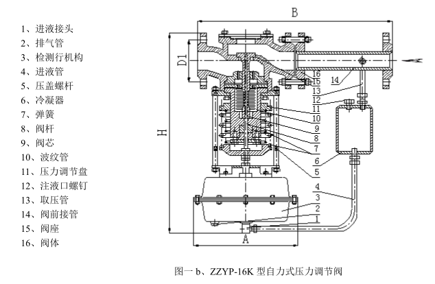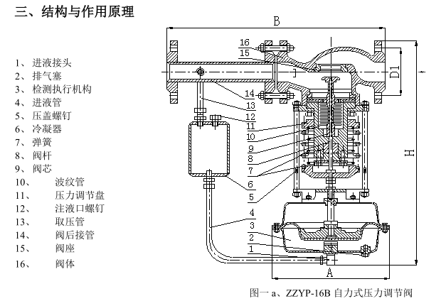 調(diào)壓閥主要有檢測執(zhí)行機構、調(diào)壓閥、冷凝器與閥后接管等腰三角形四部分組成,其結(jié)構(見圖一)。
