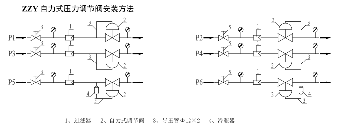 P5:調(diào)節(jié)蒸氣,閥前壓力調(diào)節(jié)(K型),應裝冷凝器(4),建議裝過濾器(1)