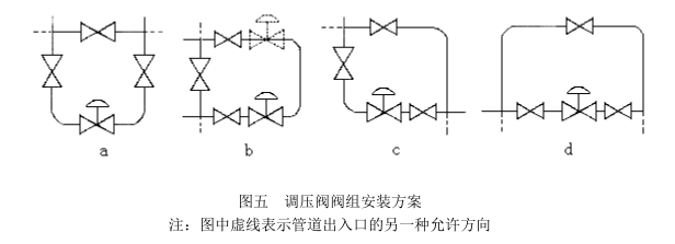 圖五 調(diào)壓閥閥組安裝方案注:圖中虛線表示管道出入口的另一種允許方向